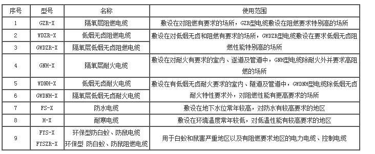 注:1、X-表示常用的電纜型號(hào)。2、特種電纜型號(hào)是在常規(guī)電纜型號(hào)前加特種型號(hào)。